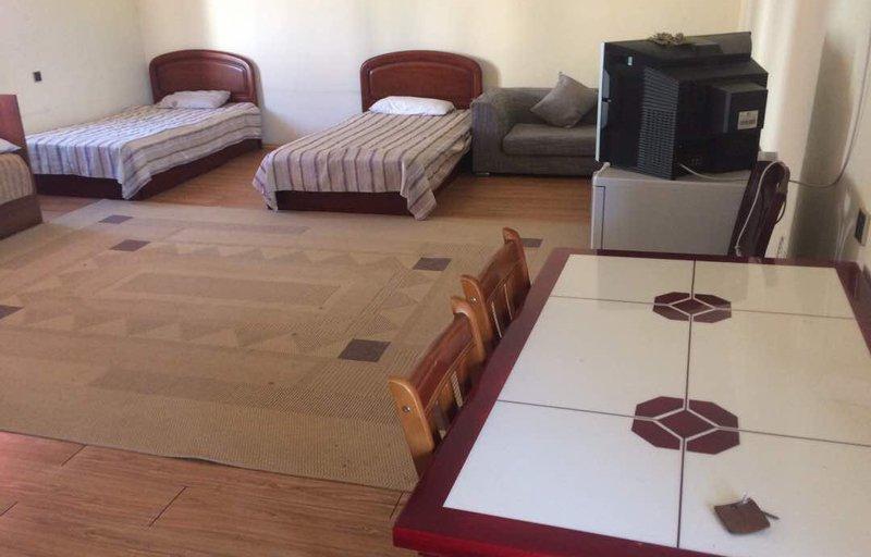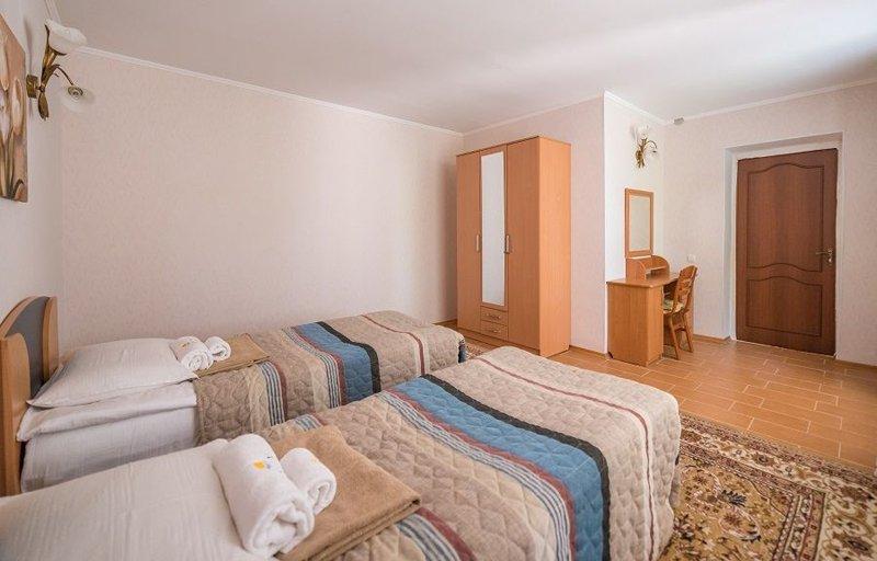В номере две полуторные кровати, стол, стулья, холодильник, душ, санузел