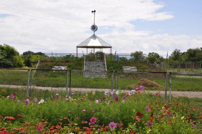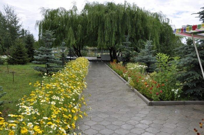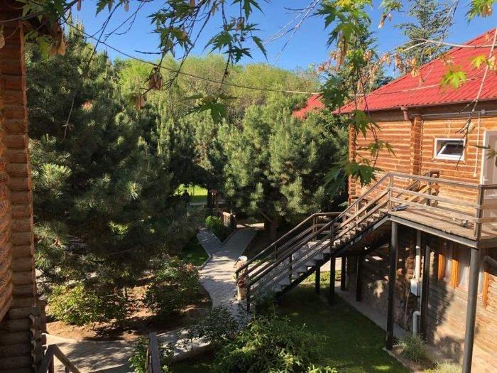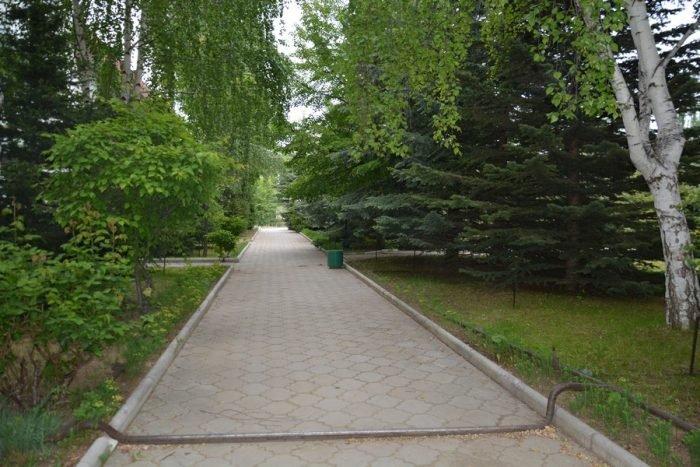 Туристический комплекс расположен в парковой зоне, буквально утопает в зелени: ели, березки, ивы склоняются над узкими пешеходными дорожками в плитке, вдоль аллей высажены цветы, бьет фонтанчик, расставлены скамейки с козырьками от солнца.