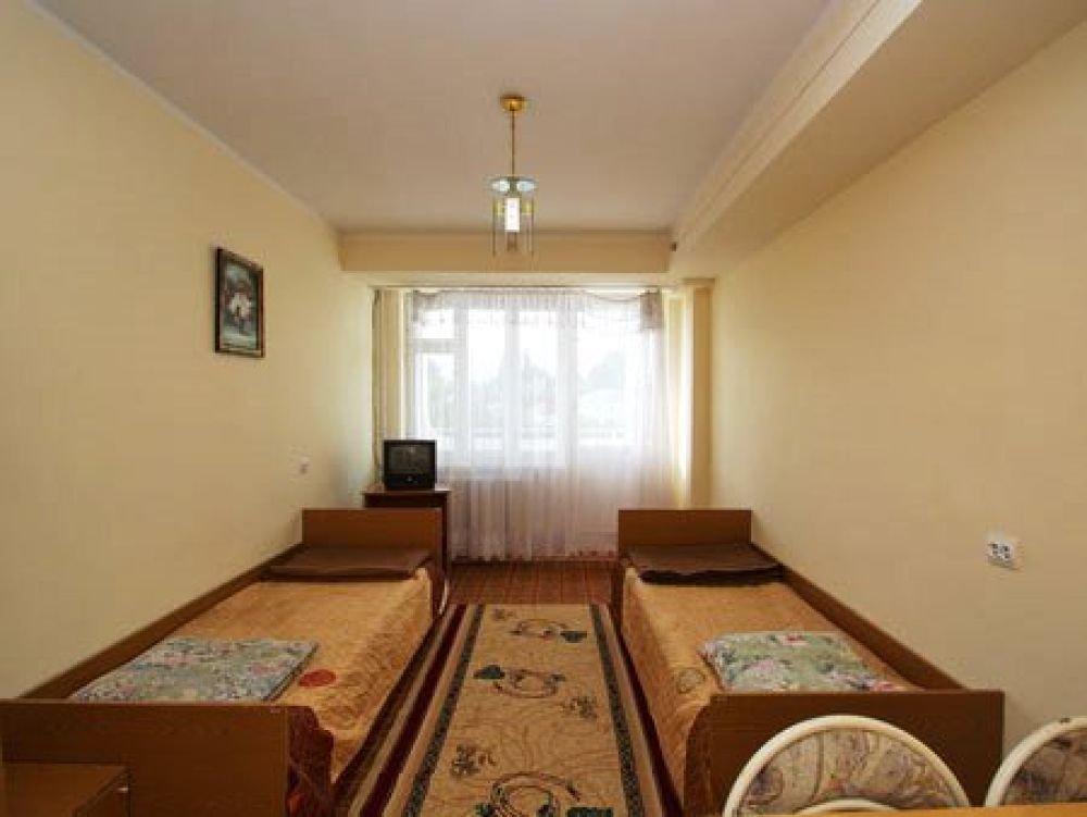 Одна комната, 2-е кровати односпалки, прикроватные тумбочки, все номера с балконом, туалет, ванная и умывальник с горячей и холодной водой круглосуточно, вешалка, ТВ, холодильник, стол, стулья, шкаф, коврик, стены под яйцо, занавеска, балкон выходит на горы (север) - отличие от стандарта: просторнее и уютнее, сам корпус новее.
